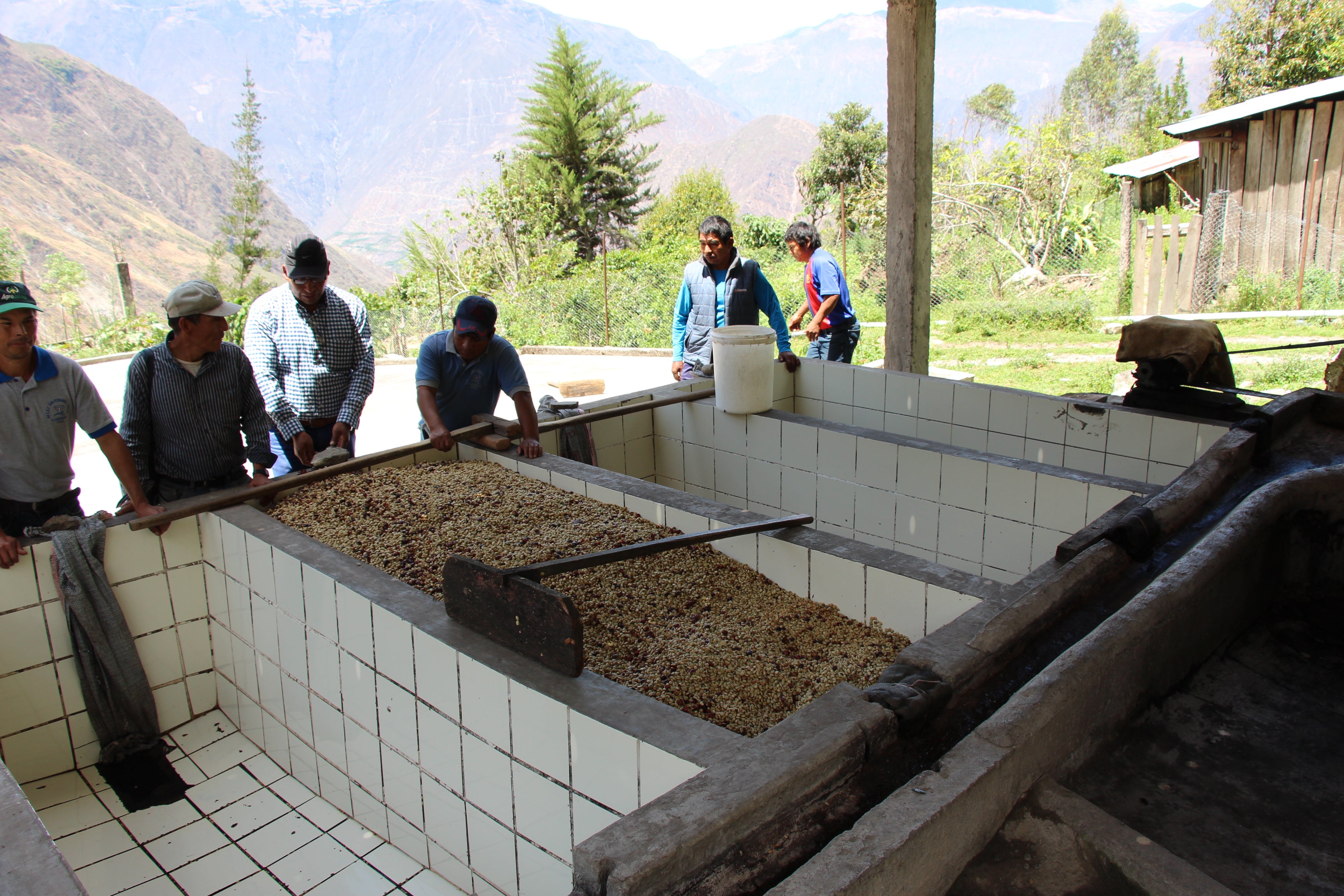 In the washed (or wet) processing method, coffee goes through a de-pulper which separates the seeds from the coffee cherry. Some mucilage will still ramain on the seed. The coffee will then be placed in vats of water and left to ferment for 24-48 hours (generally), after which, they will be washed to remove any remaining mucilage. The fermentation process makes removing all of the mucilage easier. Then the coffee will be placed on patios, raised beds, or in mechanical driers until the coffee reaches a moisture content of 10-12%. Washed coffees tend to have more brightness, acidity, clarity, and less body than natural coffees.
